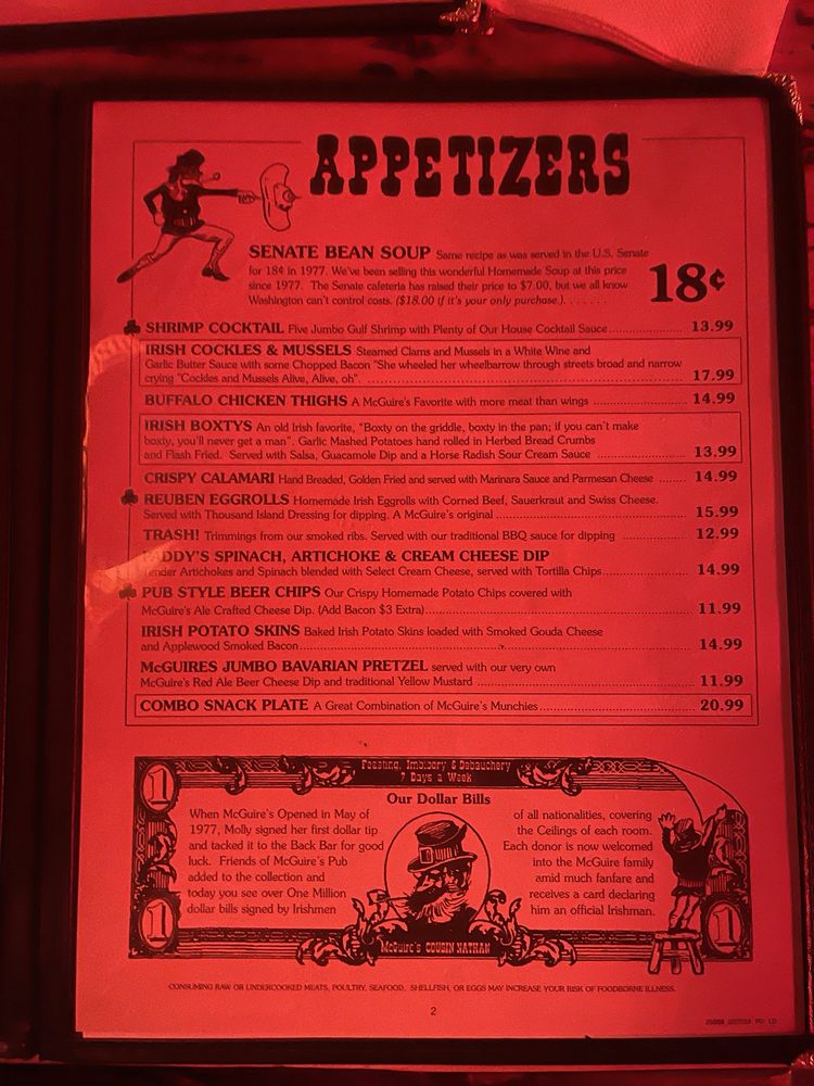 Introducing the menu at McGuire's Irish Pub, a beloved steakhouse in Destin, FL. This iconic restaurant offers a wide range of options for all types of diners, including vegetarians. With a casual and lively atmosphere, McGuire's is the perfect spot for a group gathering or a fun night out. Known for their excellent service and live music, the best nights to visit are Thursday, Friday, and Saturday. Enjoy happy hour specials, a full bar, and even private dining options. Whether you're in the mood for a hearty steak or just a casual meal, McGuire's has something for everyone. Don't miss out on their unique dishes and welcoming environment. Make sure to try their signature dishes and savor the flavors of McGuire's Irish Pub.